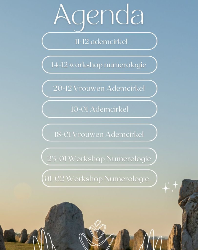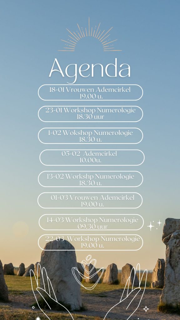 De agenda voor de komende maanden. Workshop Numerologie, Ademcirkel en Vrouwen ademcirkel. Meer informatie staat in de losse aankondigingen. Lijkt het je leuk om ergens aan deel te nemen laat het me weten via de mail of bel of stuur een whatsapp berichtje. Wil je jouw numerologie 1 op 1 uitgelegd krijgen dan kan dat […]